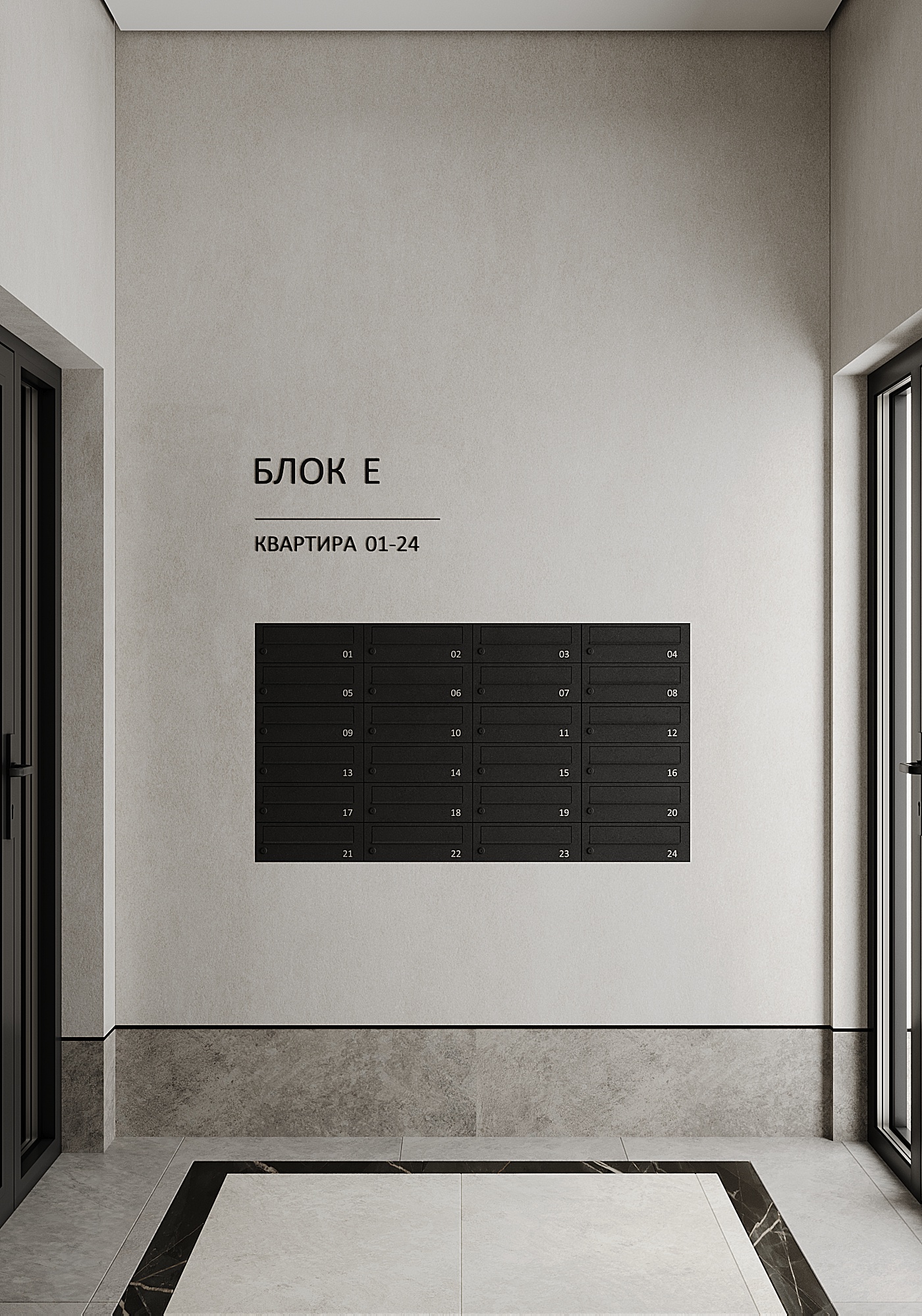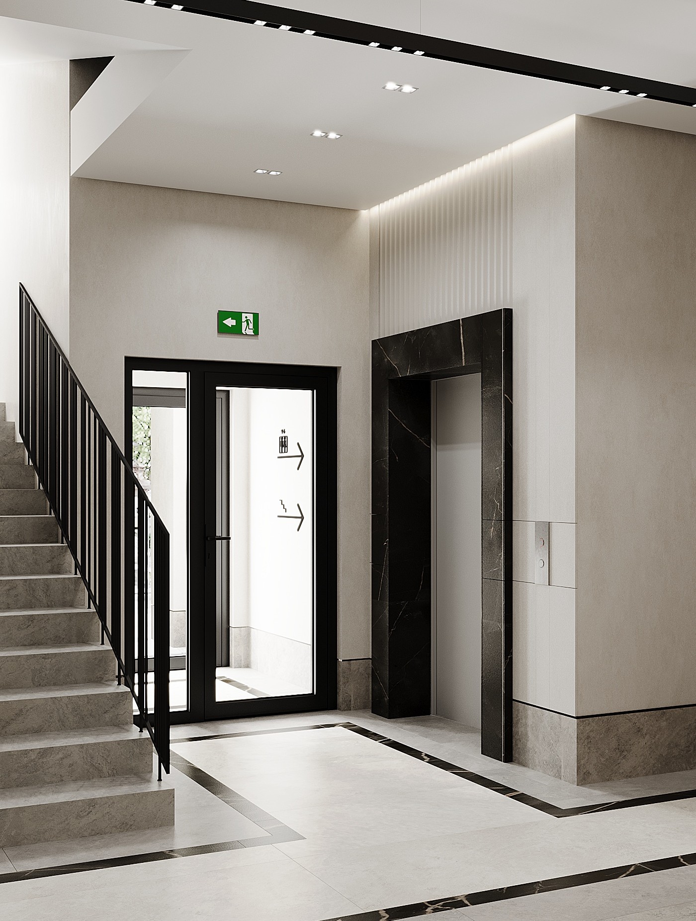 Фасады выполнены в стиле арт-деко с использованием фиброцементных панелей в сочетании с клинкерной плиткой. Каждый подъезд оборудован бесшумным грузопассажирским лифтом Fuji, с грузоподъемностью до 630 килограммов. На техническом этаже расположены кладовые помещения, их количество ограниченно.