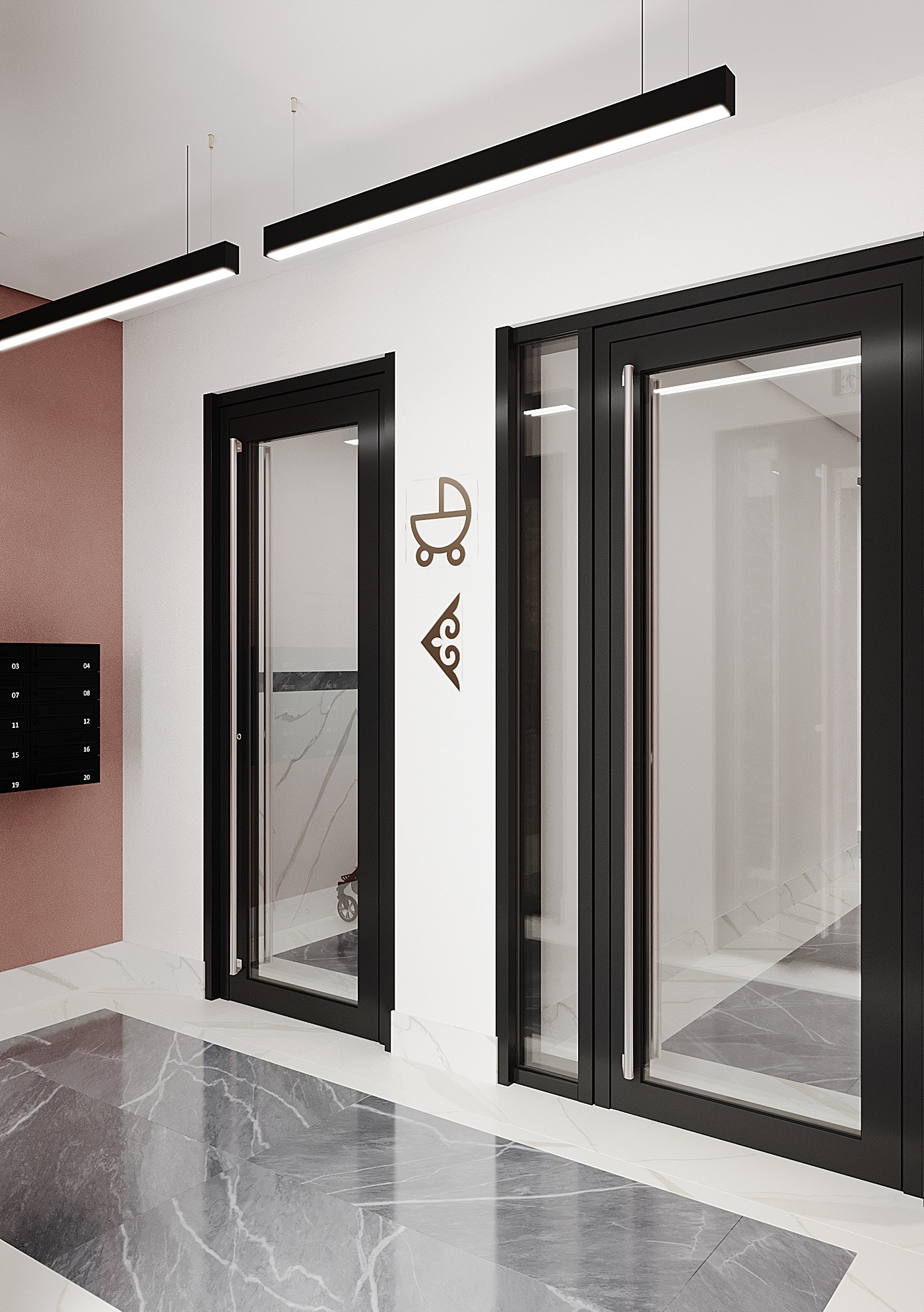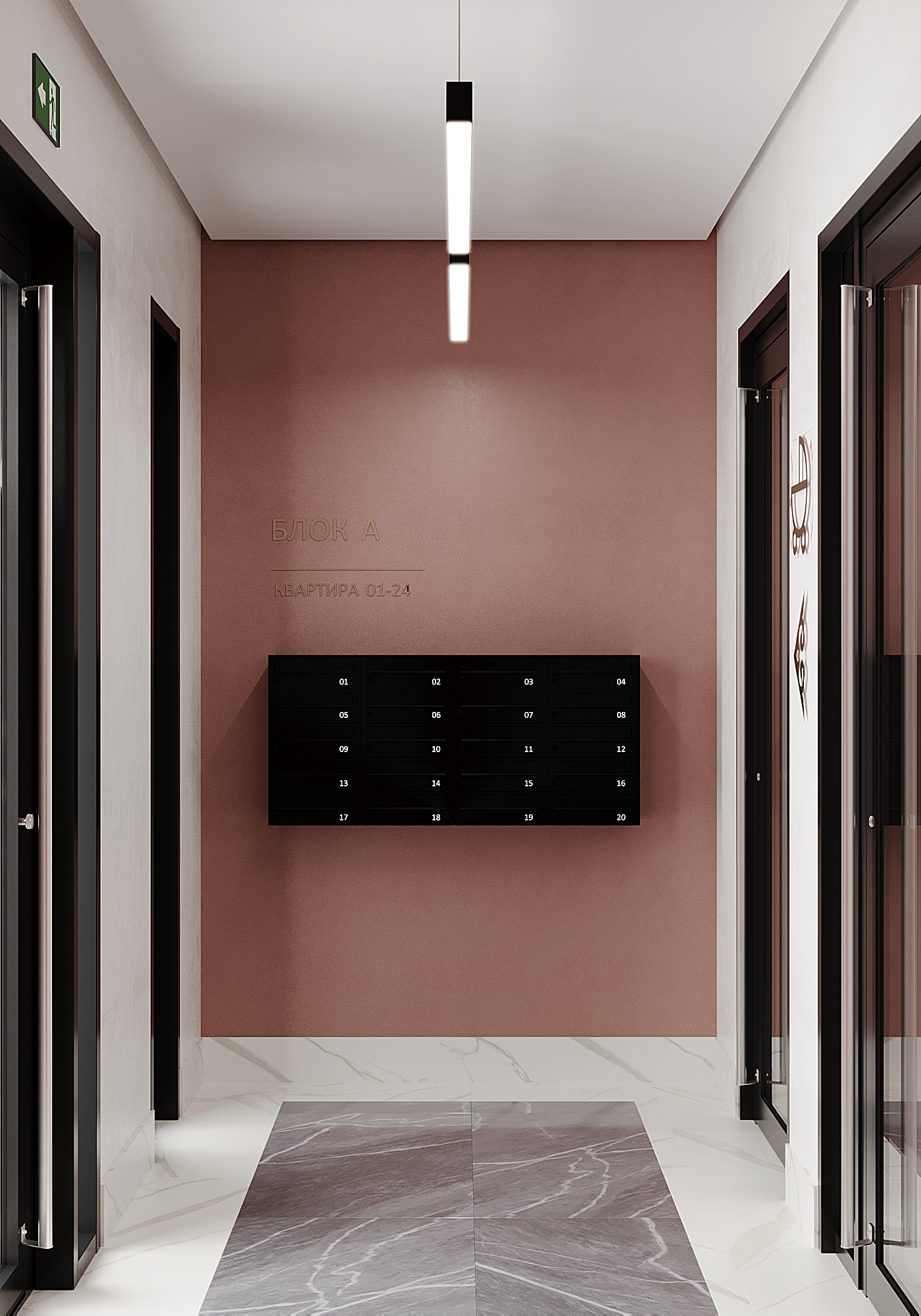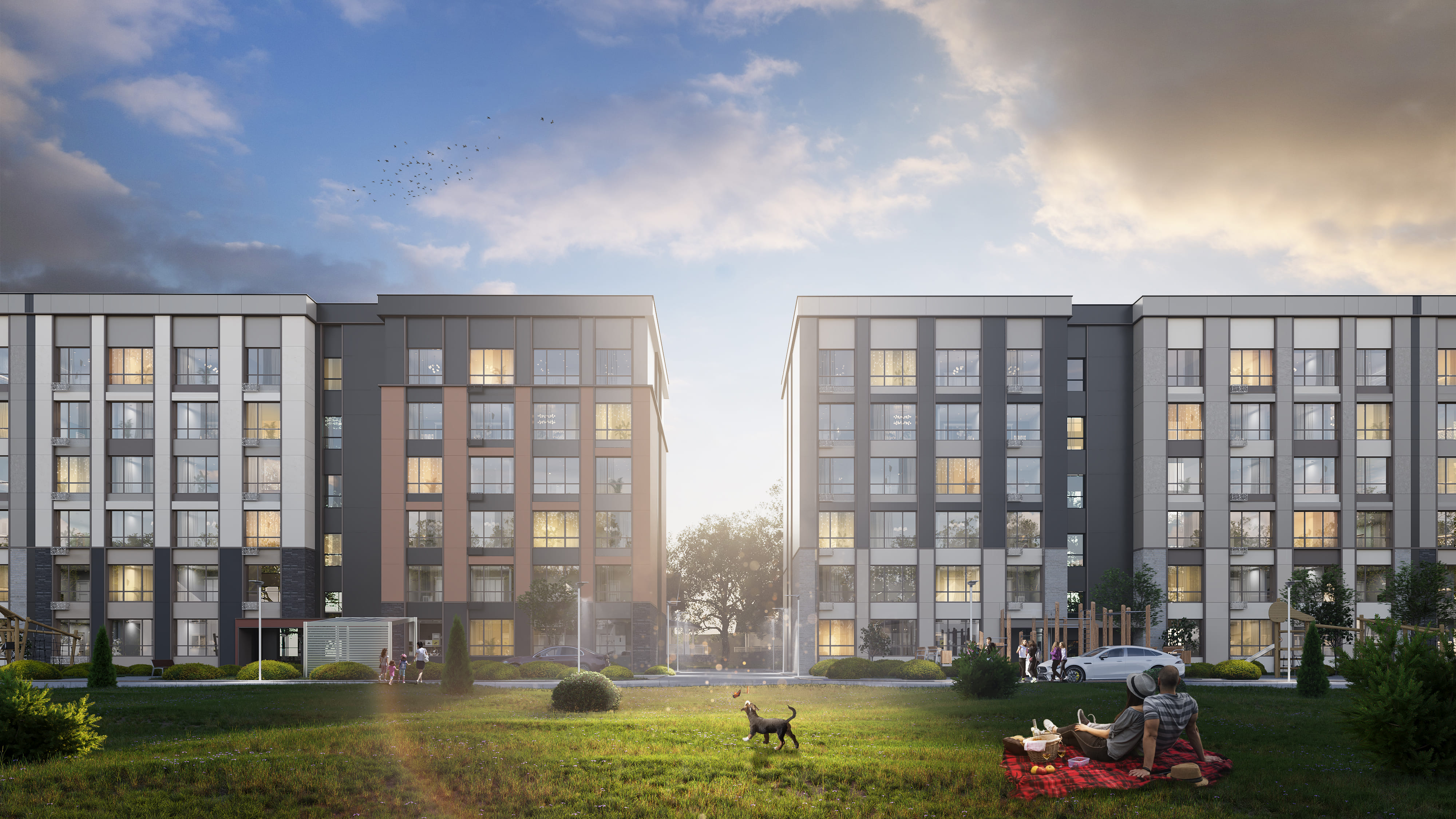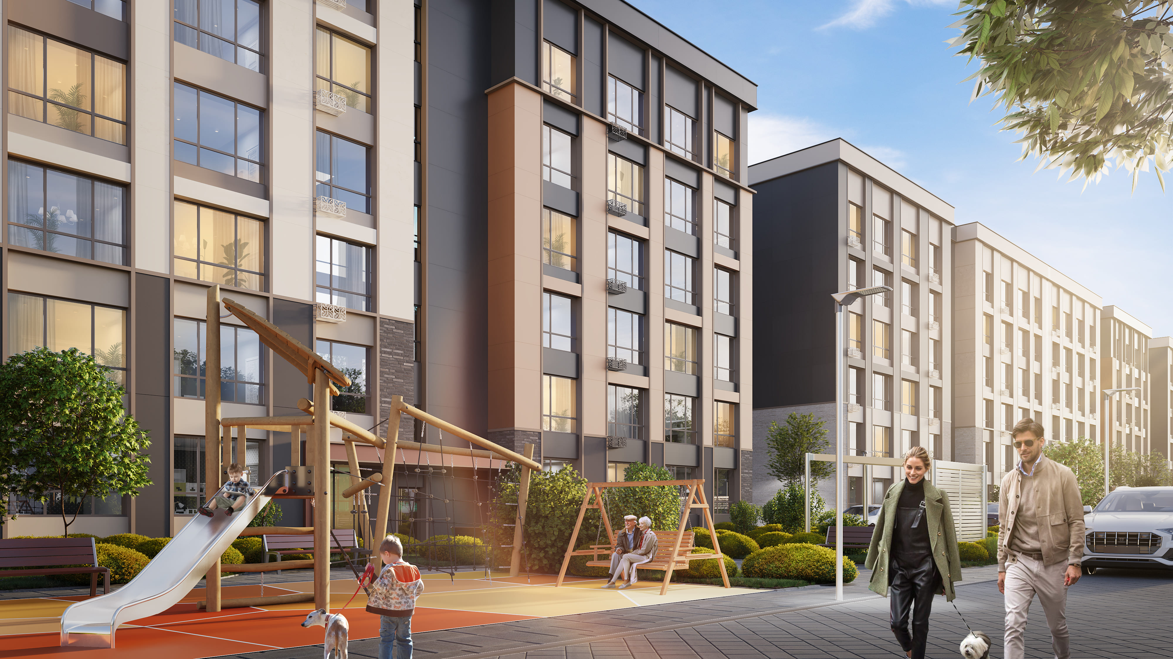 Класс комплекса — комфорт, однако вся внешняя облицовка здания выходит далеко за пределы третьего класса. Отделка включает антрацитовые фиброцементные панели и клинкерную плитку, благодаря чему внешне комплекс легко вписывается в критерии бизнес-класса. Широкоформатные окна со сложным открыванием, тяжёлые металлические двери и керамогранитная отделка общедомовых площадей только подтверждает претензию комплекса на звание самого перспективного капиталовложения.